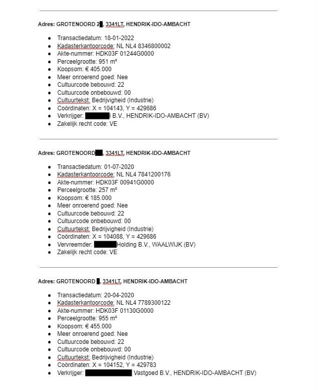 In dit rapport vindt u niet alleen de koopsom van recent verkochte panden, maar ook de transactiedatum, de oppervlakte (in m²), het type pand (zoals kantoor of industrie), en de gegevens van zowel de verkoper als de koper. Met deze waardevolle informatie bent u altijd op de hoogte van de actuele marktontwikkelingen, wat u een voorsprong geeft bij het aankopen van uw volgende bedrijfspand!